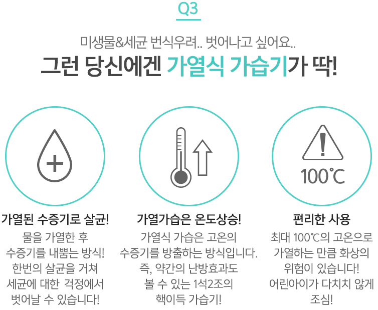 아무래도 물을 사용하는 가전제품이다 보니 세균번식의 우려가 있는데요, 이러한 것이 걱정되신다면 가열식 가습기를 선택하시는 것이 좋습니다. 이 가습기는 가열된 수증기를 내뿜는 방식이기 때문에 자체적인 살균작용을 거쳐 세균에 대한 걱정에서 벗어날 수 있고, 고온의 수증기가 나오기 때문에 조금의 난방효과도 볼 수 있습니다. 단지 아쉬운 점은 최대 100도씨 까지 온도가 올라가기 때문에 화상의 위험이 있다는 점입니다.