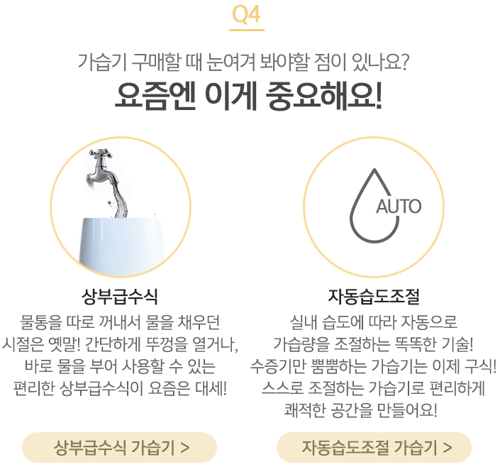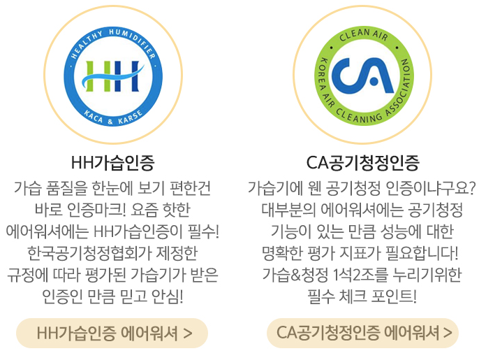 가습기 구매하실 때 눈여겨 봐야 하는 점이 있는데요, 상부급수식 가습기(바로 물을 부어 사용할 수 있는지) 인지, 자동으로 습도 조절이 가능한 가습기 인지, 그리고 가장 중요한 HH가습인증과 CA공기청정인증(에어워셔)이 있는지 보셔야만 조금더 안전하고 좋은 가습기를 선택하실 수 있습니다.