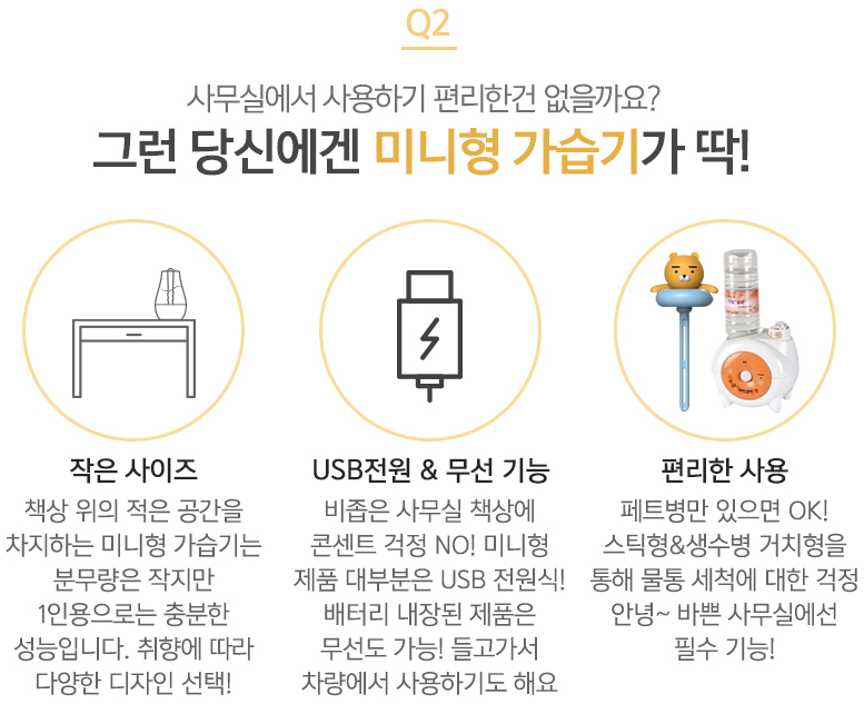 사무실에서 사용할 때에는 보통 개인용으로 미니형 가습기를 많이 쓰시는데요, 미니형은 말그대로 적은 공간을 차지하고 분무량은 작지만 1인용으로는 충분한 성능을 나타내고 있습니다. 특히 아기자기 하고 다양한 디자인으로 출시되고 있으니 원하는 디자인으로 구매하시면 될 것 같습니다. 보통은 USB 전원을 사용하는데요, 배터리가 내장되어 있는 제품도 있기 때문에 무선을 원하신다면 배터리 내장 제품을 구매하시는 것이 좋습니다. 간편하게 페트병을 이용한 미니가습기도 있기 때문에 물통세척이 귀찮으시다면 이러한 가습기를 선택하는 것도 좋겠습니다.