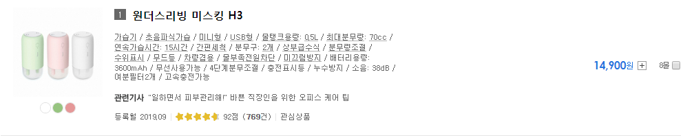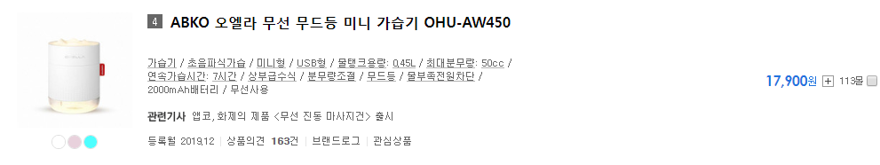 1위 원더스리빙 미스킹H3, 2위 원더스리빙 미스킹 H9, 3위 듀플렉스 DP-9990UH, 4위 ABKO 오엘라 무선 무드등 미니 가습기 OHU-AW450, 5위 캐로스 CH-N500 순 입니다.