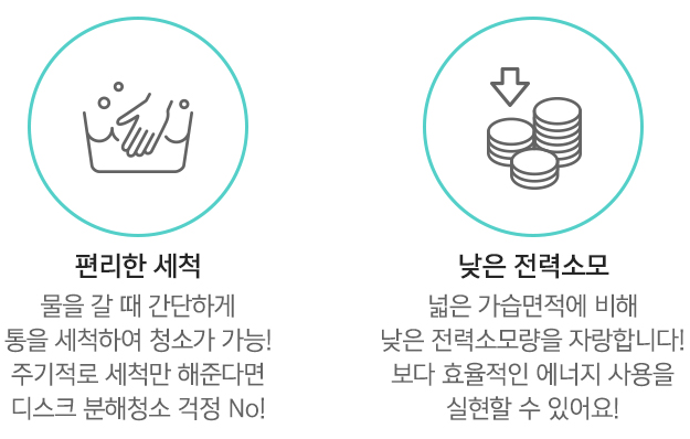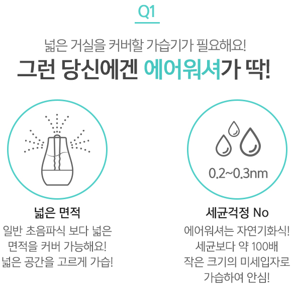 넓은 거실에서 쓸 때에는 에어워셔가 좋습니다. 일반적인 초음파식 보다는 넓은 면적을 커버하며, 고르게 가습할 수 있기 때문입니다. 에어워셔는 자연기화식이고 세균보다 약 100배 작은 크기의 미세입자로 가습하기 때문에 세균걱정은 일반 가습기보다 안하셔도 됩니다. 또, 물을 갈아 줄때 통만 세척해서 청소가 편하고, 넓은 가습면적에 비해 전력소모량이 낮기 때문에 전기세 걱정도 덜 수 있습니다.