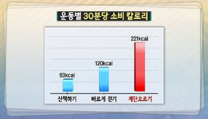30분당 소비 칼로리를 따져보면 가벼운 산책하기는 63kcal, 빠르게 걷기는 산책하기의 약 두배인 120kcal, 계단오르기는 산책하기의 3배 이상인 221kcal 정도로 칼로리가 많이 소모 됩니다.