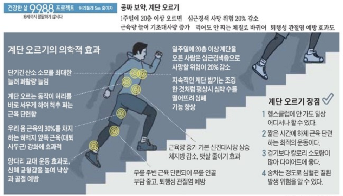 3주에 걸쳐 하루 30분 정도씩 계단오르기를 한다면 중성지방과 콜레스테롤, 혈압, 혈당등의 수치가 대부분 정상으로 돌아 옵니다. 또한 이렇게 운동한 사람들은 평균적으로 허리둘레가 2~3cm 정도의 감소 효과를 보이고 체중은 3~4kg 정도 감소해 다이어트 효과는 물론 혈관건강에도 놀라운 효과가 있습니다.
