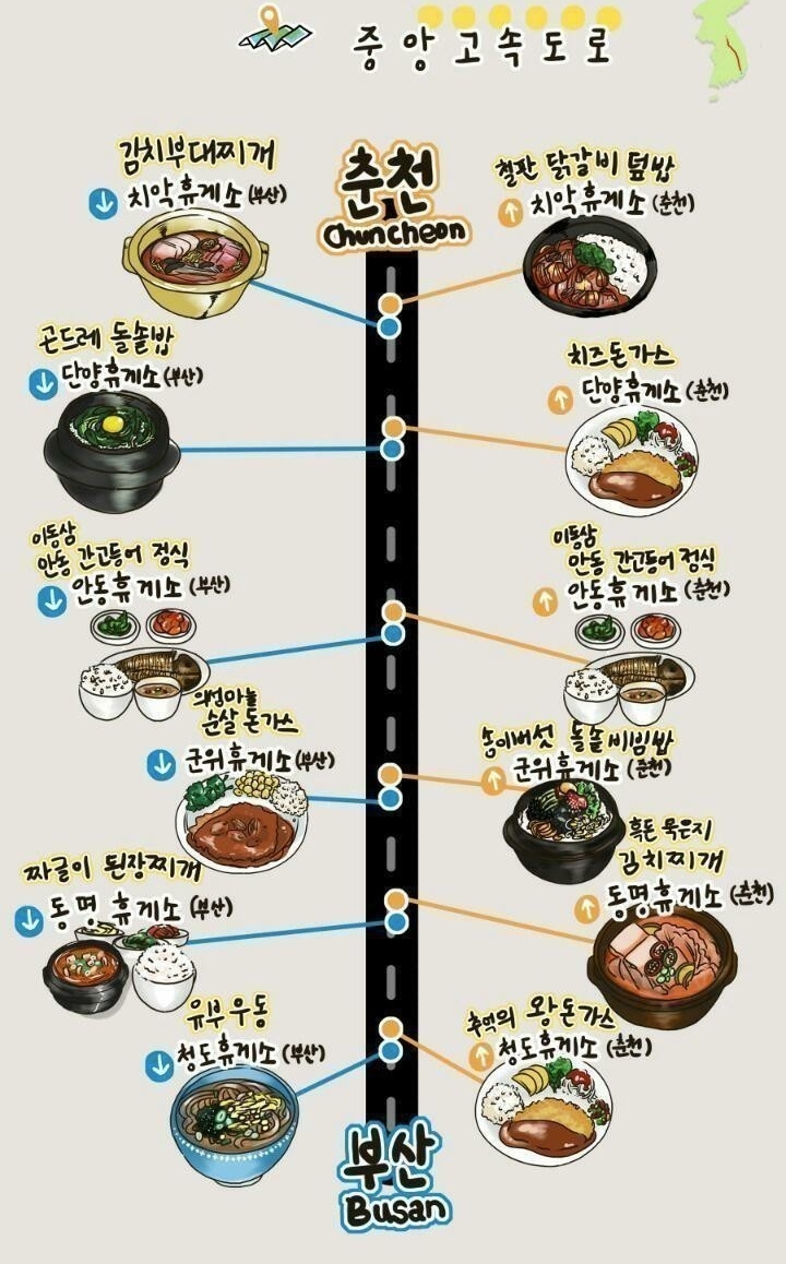 하행 : 치악휴게소(김치부대찌개), 단양휴게소(곤드레 돌솥밥), 안동휴게소(간고등어 정식), 군위휴게소(의성 마늘 순살 돈까스), 동명휴게소(짜글이 된장찌개), 청도휴게소(유부우동)