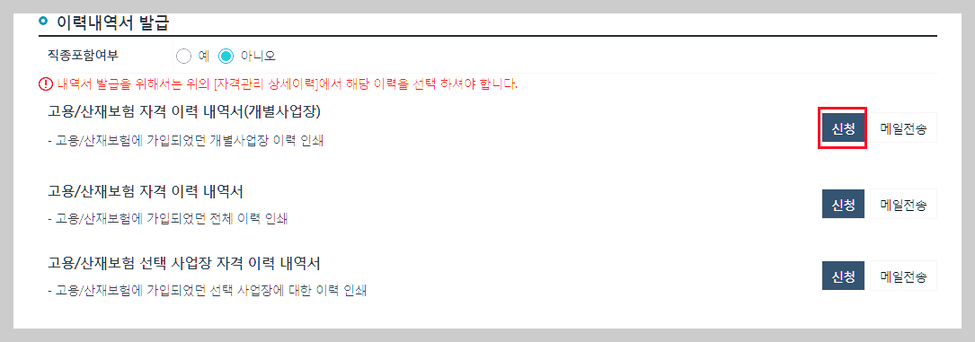- 고용 보험 가입 이력서 발급의 경우 본인이 원하는 곳만 신청하여 발급이 가능하니 확인하여 신청.