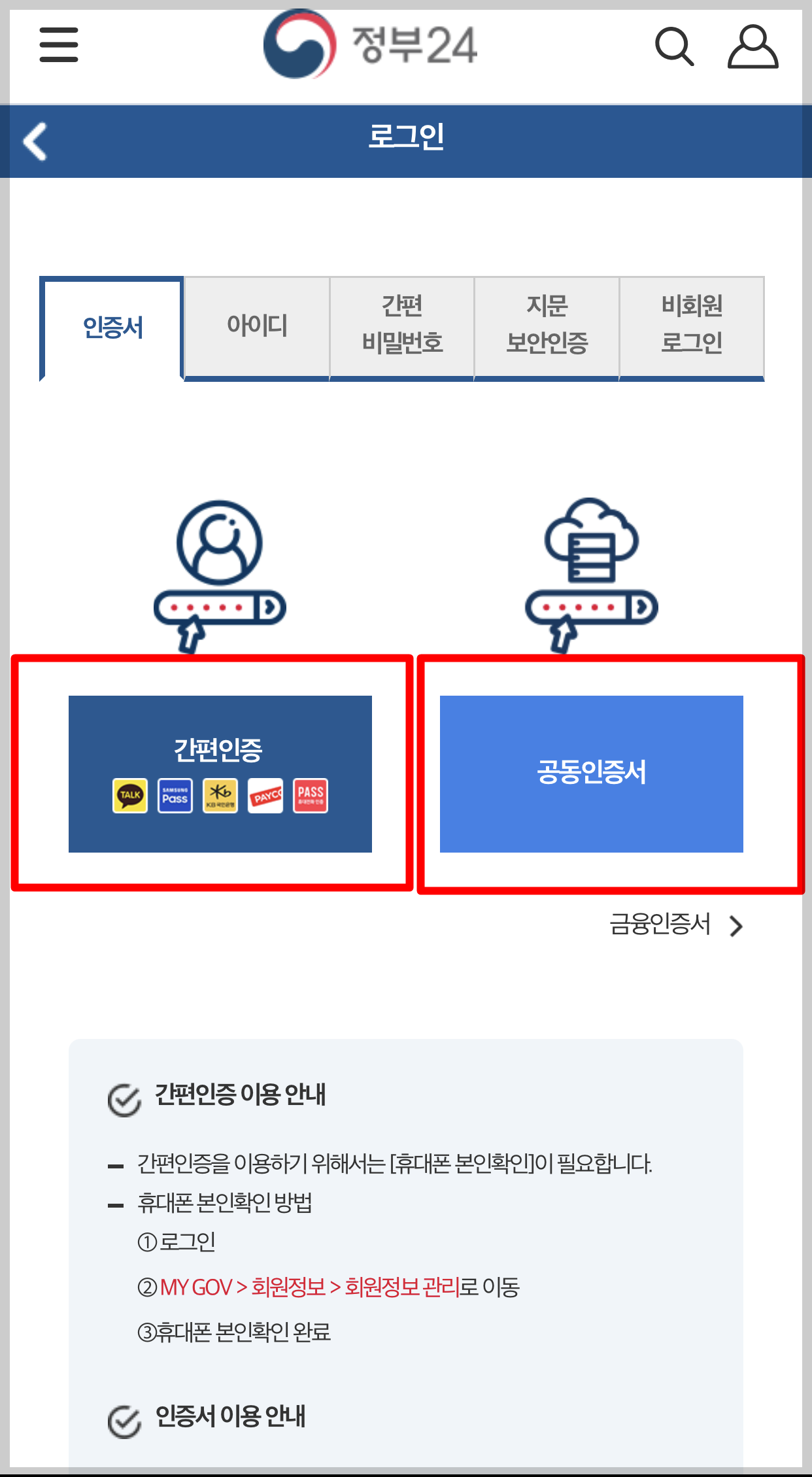 - 간편인증과 공동 인증서 방법 2가지 중 하나로 선택하여 로그인.