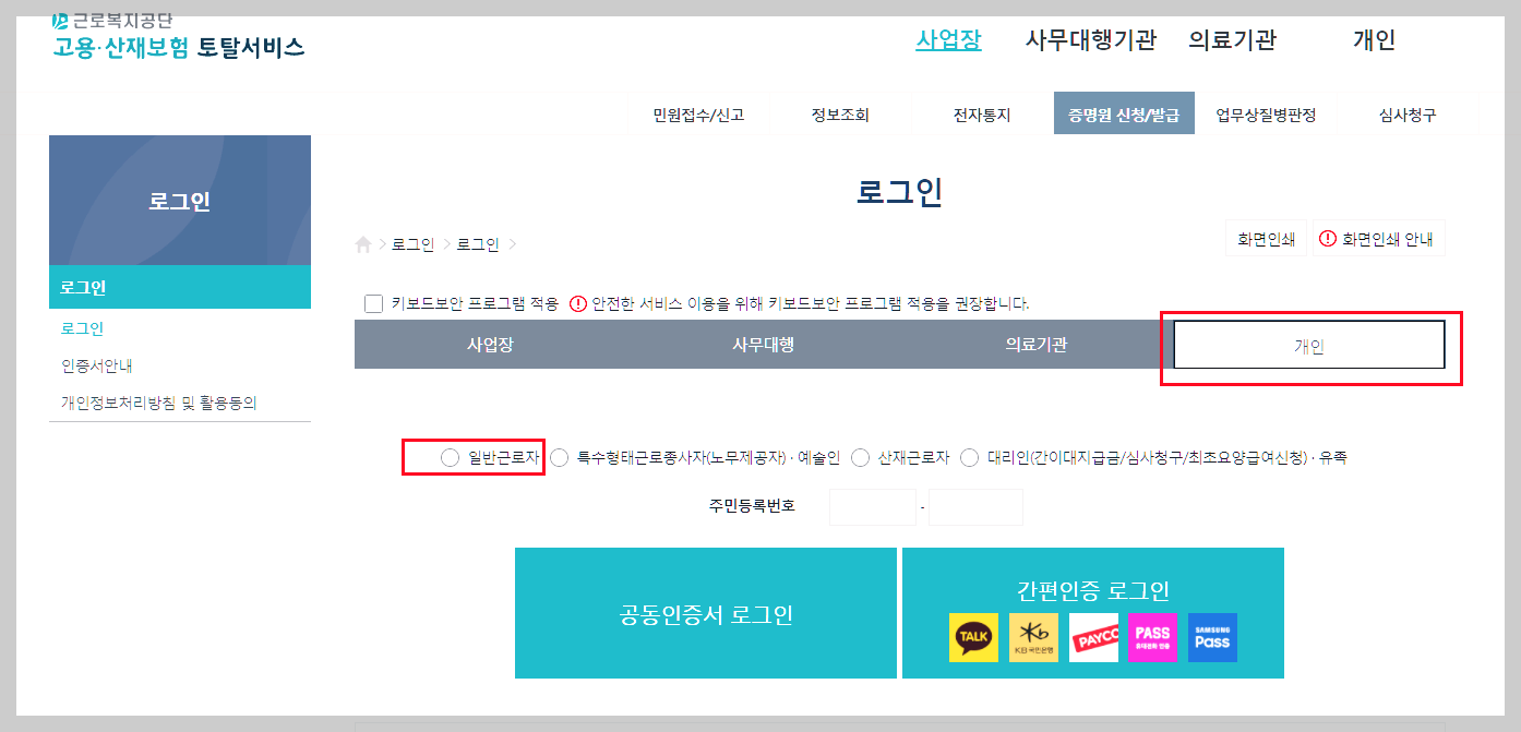 - 클릭 후에 나타나는 창에서 개인을 눌러 주시고 일반 근로자라면 일반 근로자로 눌러주세요.