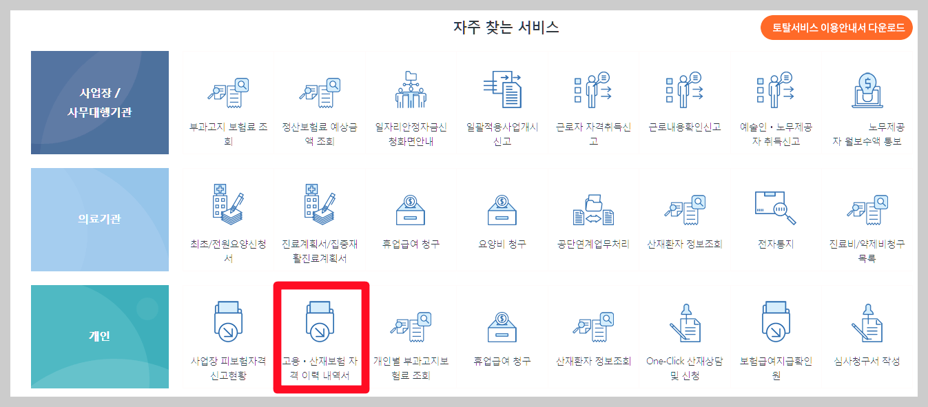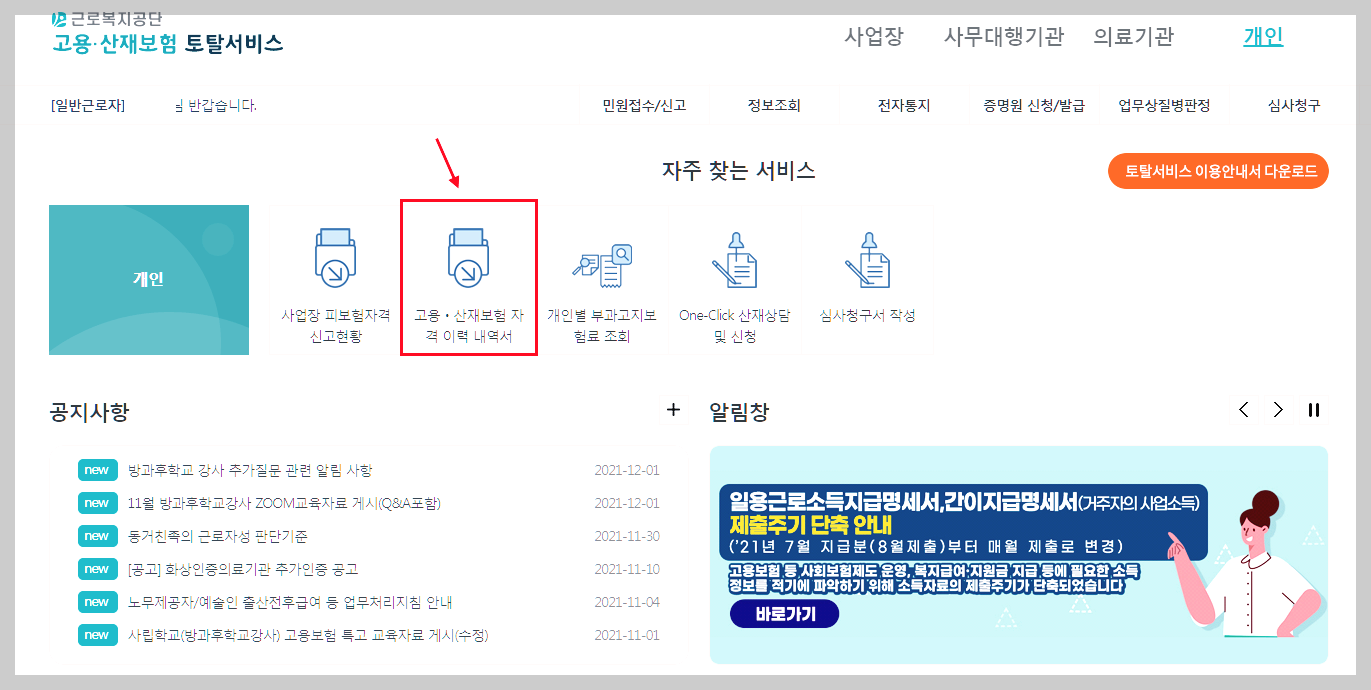 - 개인으로 로그인하고 난 후에 고용 산재보험 자격 이력 내역서를 클릭.