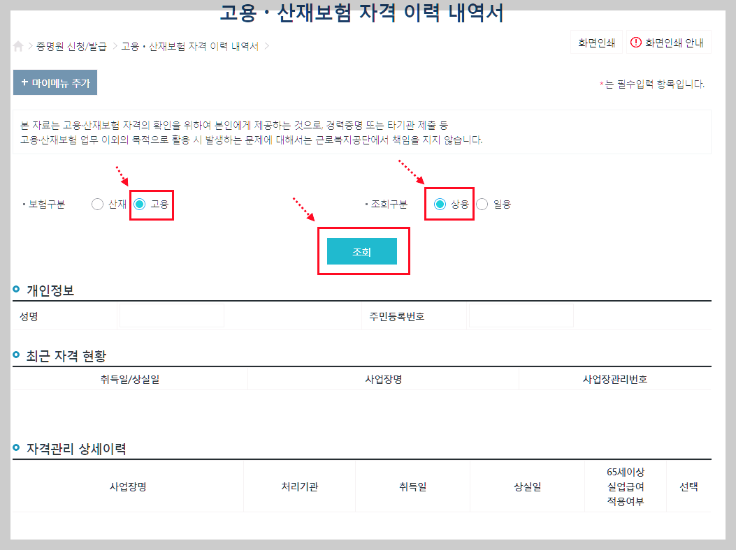 - 고용 보험 이력 내역서 발급