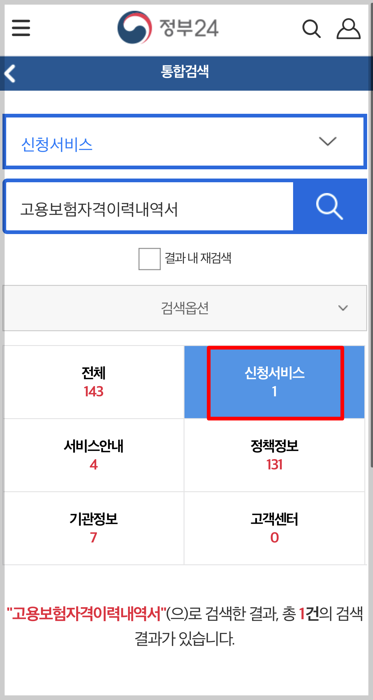 - 정부 24 돋보기 창에서 고용 보험을 검색하시면 첫 번째 나오는 고용보험 자격 이력 내역서를 클릭