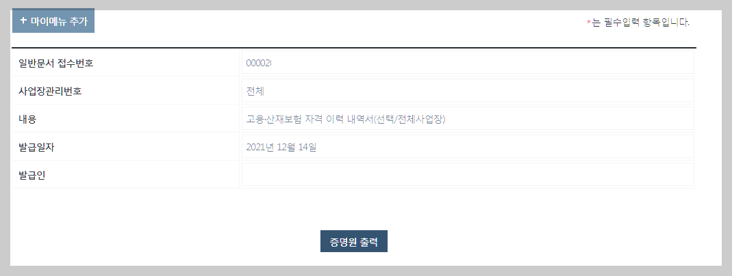 - 고용 보험 가입 이력서 증명원까지 출력하는 창이 나오고, 증명원 출력을 누르면 출력이 간편하게 가능.