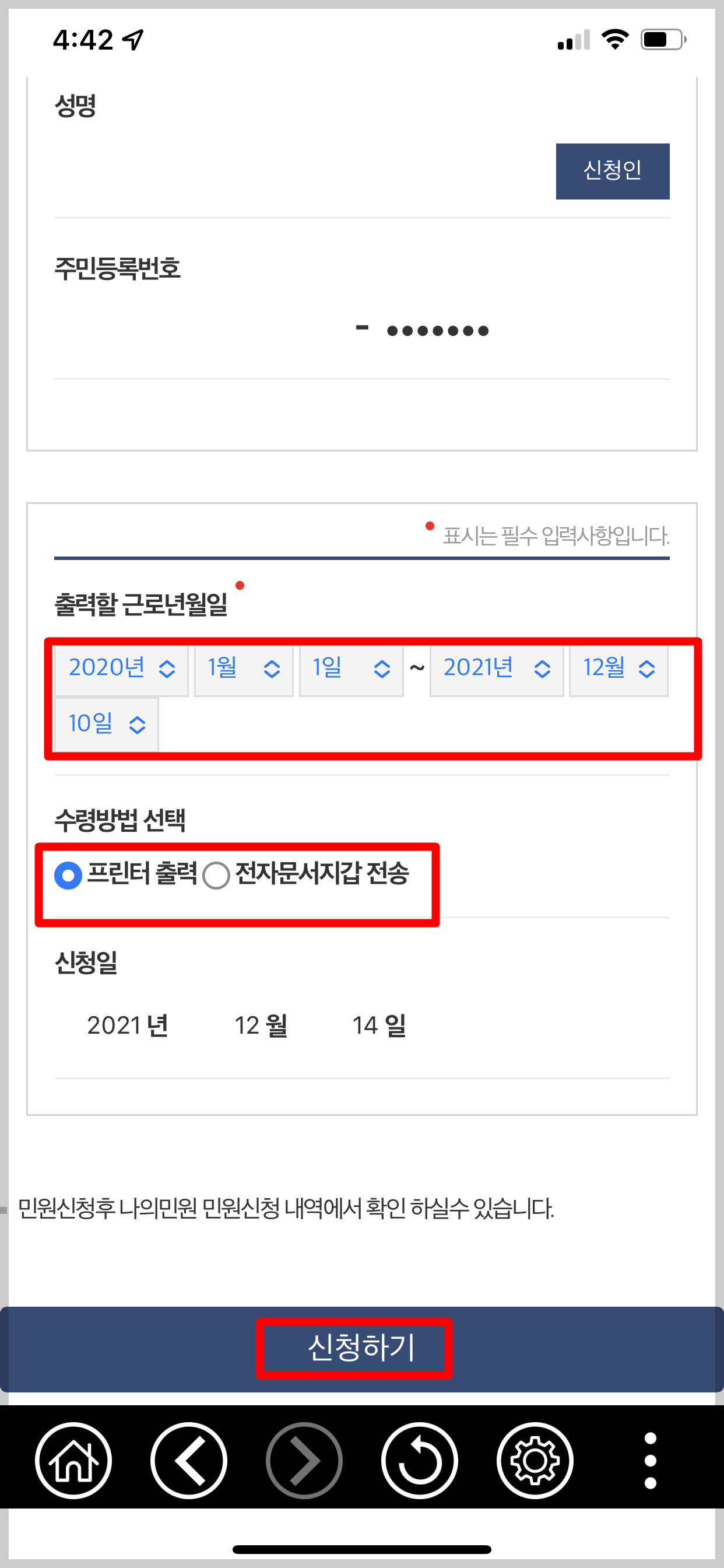 - 완료된 고용 보험 자격 이력 내역서는 핸드폰을 캡쳐하여 이메일이나 카카오톡으로 옮겨서 출력.