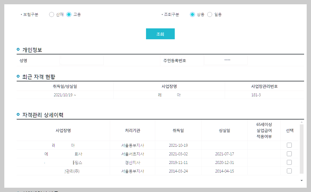 - 고용보험이 가입되어있다면 아래처럼 자격 관리 상세 이력이 나와야 합니다.