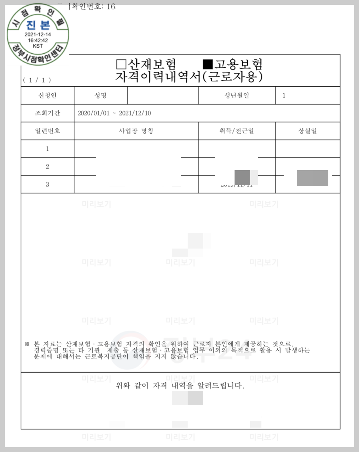 - 고용 보험 자격 이력 내역서가 완료.