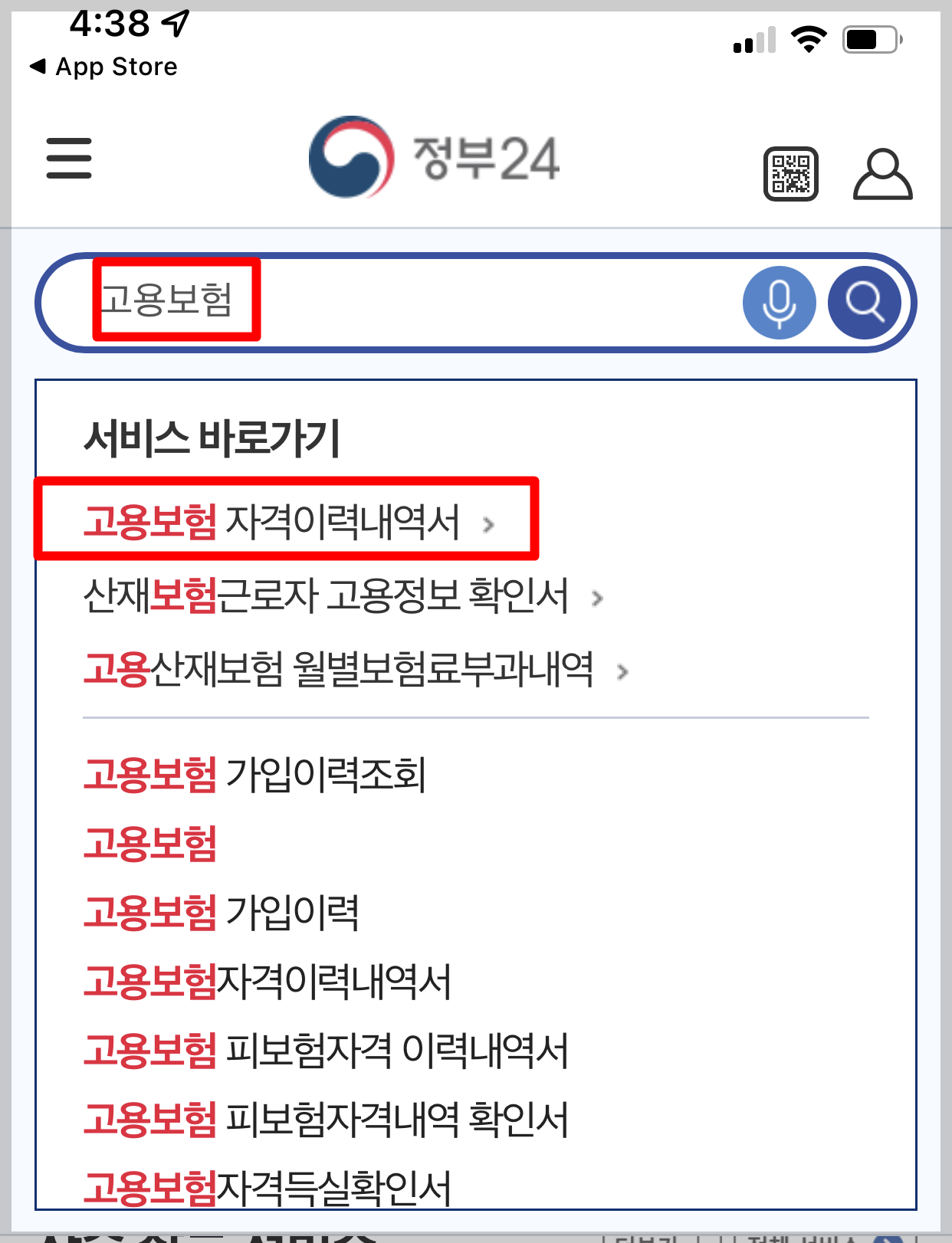 - 고용 보험 가입이력 조회를 위해 모바일 어플에서 정부 24를 다운로드하여 주세요.