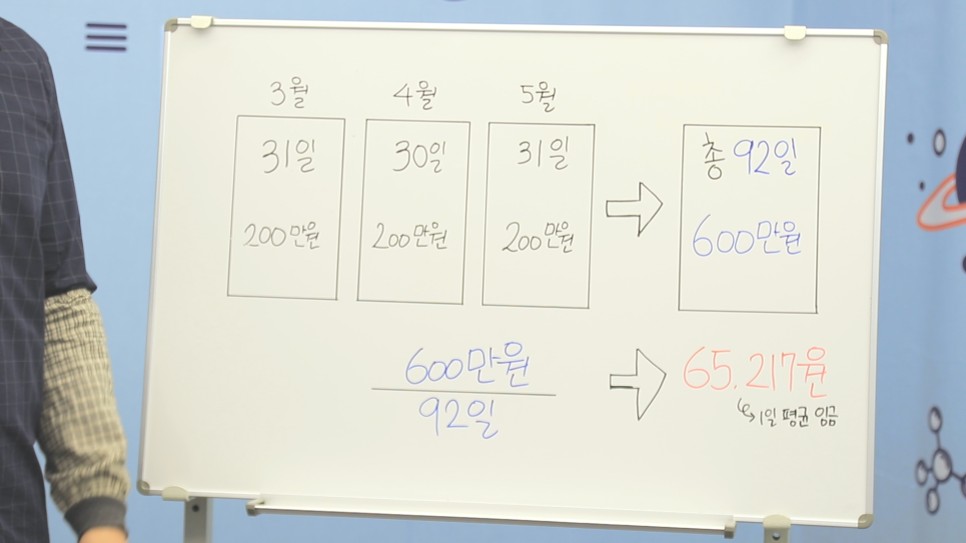 3개월의 총 월급 600만원에서 3개월 총 근로일수 92일을 나눕니다.