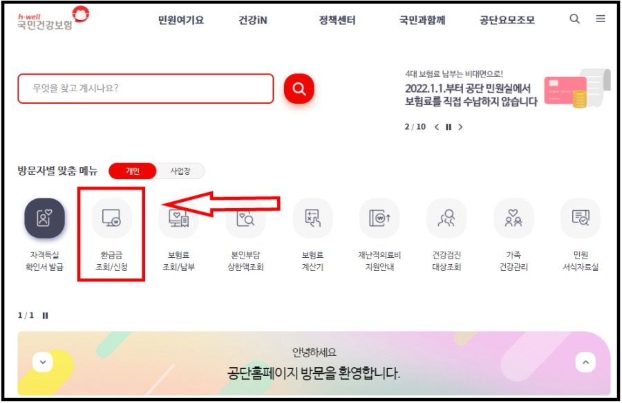 - 국민건강보험공단 홈페이지에서 ” 환급금조회/신청 “을 클릭
