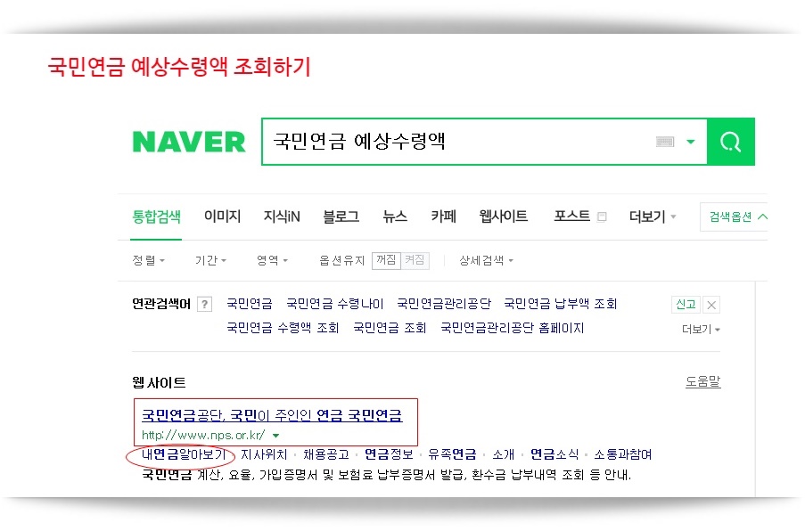 그럼 국민연금 예상수령액 조회를 해보겠습니다. 아래와 같이 검색창에 국민연금 예상 수령액 치신 뒤 동그라미의 내 연금 알아보기 클릭해 주세요.