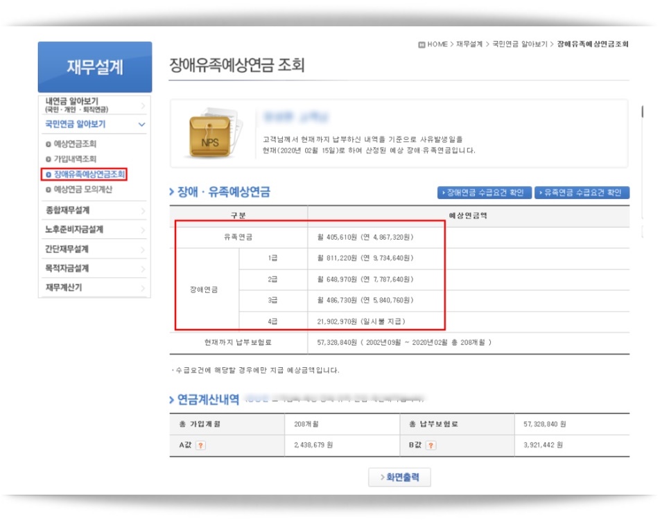장애, 사망 시 장애 연금 유족연금도 조회 가능합니다. 현재가치의 노령연금액과 미래가치 예상 연금액도 확인 가능하고