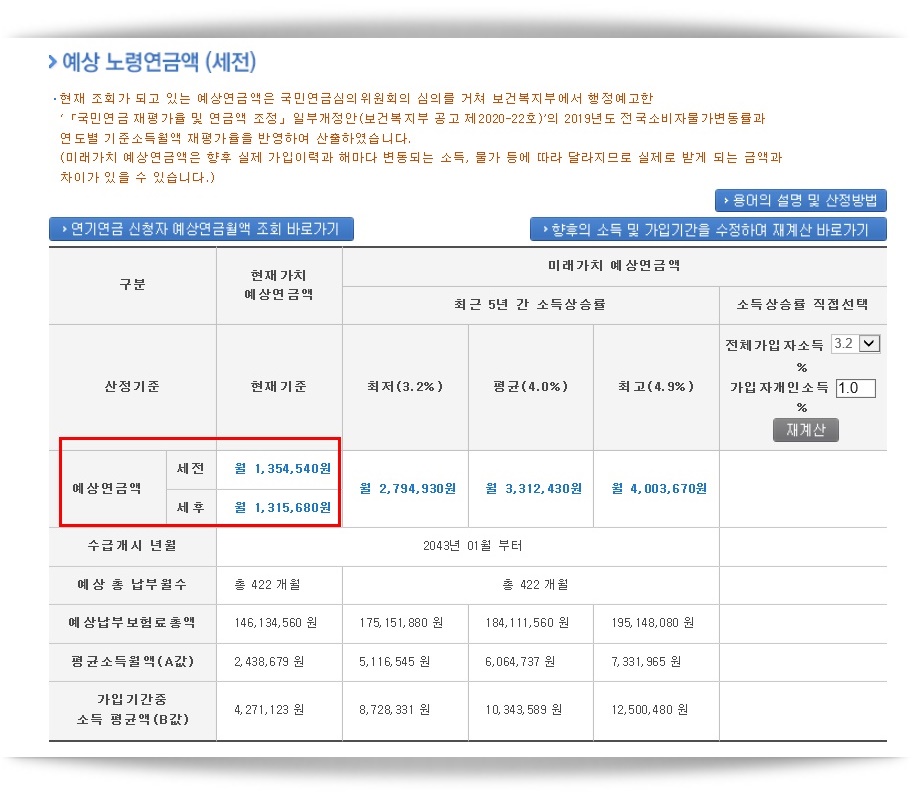 몇 개월 동안 얼마를 납부했는지 세전 세후 둘 다 보실 수 있어요. 후에 소득이 변할 가능성이 매우 높고 지급 희망 연령이 다르거나 개인적인 사정으로 가입 기간에 변동 사항이 있을 수 있어 직접 소득 및 가입 기간을 수정해 계산할 수 있습니다.