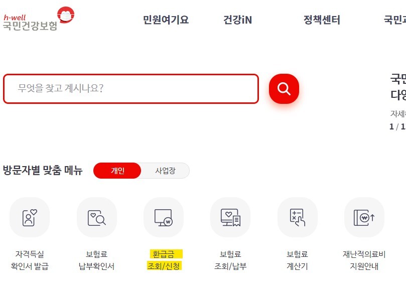 건강보험홈페이지 첫 화면에서 환급금 조회/신청으로 들어갑니다.