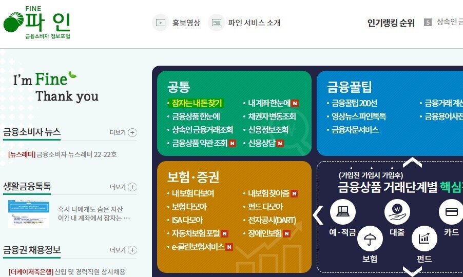 금융감독원 파인 사이트의 첫 화면에서 잠자는 내돈찾기로 들어갑니다.