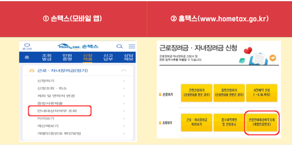 안내문을 받지 못했거나 분실 등으로 ‘안내대상자 여부’ 또는 ‘개별인증번호’를 모르는 경우에는 손택스(모바일 앱)과 홈택스에서 확인할 수 있습니다.