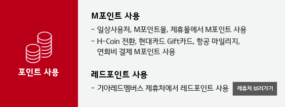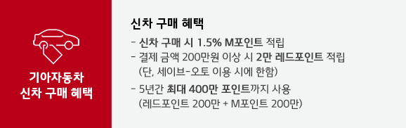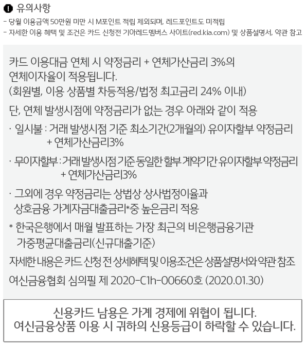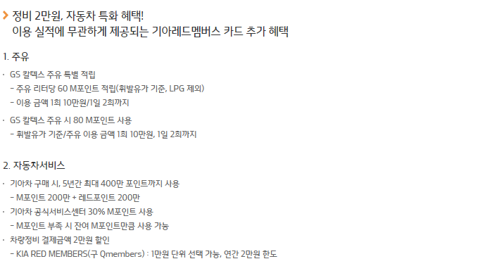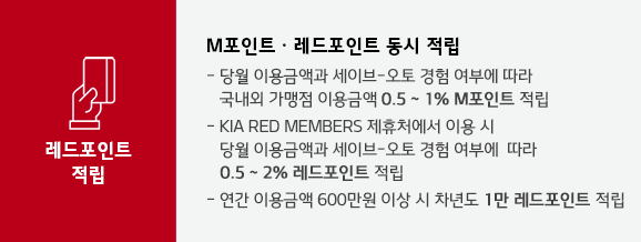 국내외 가맹점 이용금액의 0.5~1%가 M포인트로 적립되며 기아 레드 멤버스 제휴처에서 이용 시에는 0.5~2%가 레드 포인트로 추가 적립된다고 하며, 기아차 신차 구매 시에는 세이브 오토 이용 및 카드 결제 금액이 200만원 이상일 경우 2만 레드 포인트가 적립된다고 합니다.