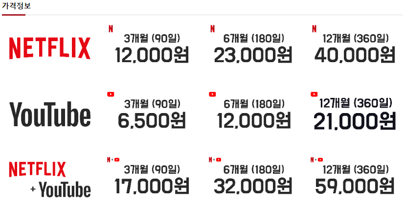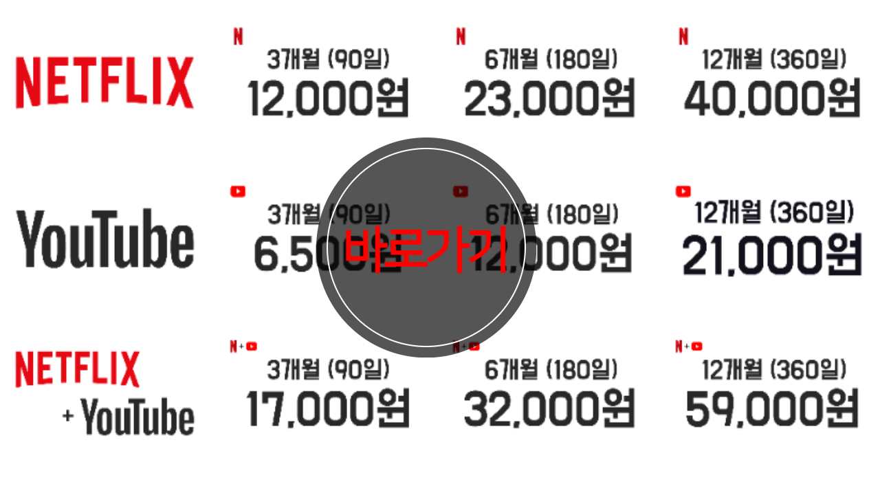 넷플릭스는 물론 유튜브, 왓챠, 웨이브 등 다른 OTT 서비스도 저렴하게 이용하실 수 있으니 참고하시길 바랍니다. 이미지 하단에 있는 바로가기 링크를 통해 바로 이동하실 수 있습니다.