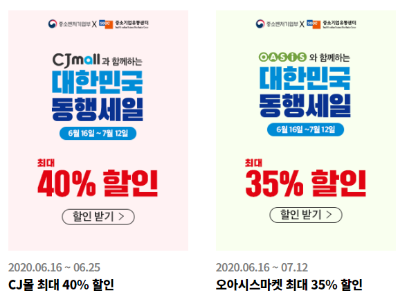 CJ몰은 최대 40% 할인, 오아시스마켓은 최대 35% 할인을 제공합니다.