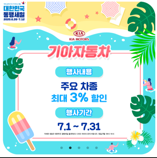 기아자동차는 최대 3% 할인이 들어갑니다. 기간은 7월 1일 부터 31일 까지 입니다. 차량 구매 계획 있으신 분들에게는 좋은 기회가 아닐까 생각합니다.