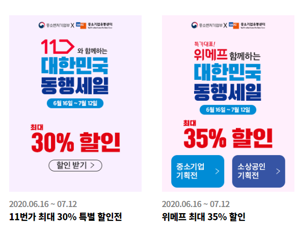 11번가는 동행세일 기간 중 최대 30% 특별 할인전 행사를 개최하고 위메프는 동행세일 기간 중 최대 35% 할인을 받을 수 있습니다!!