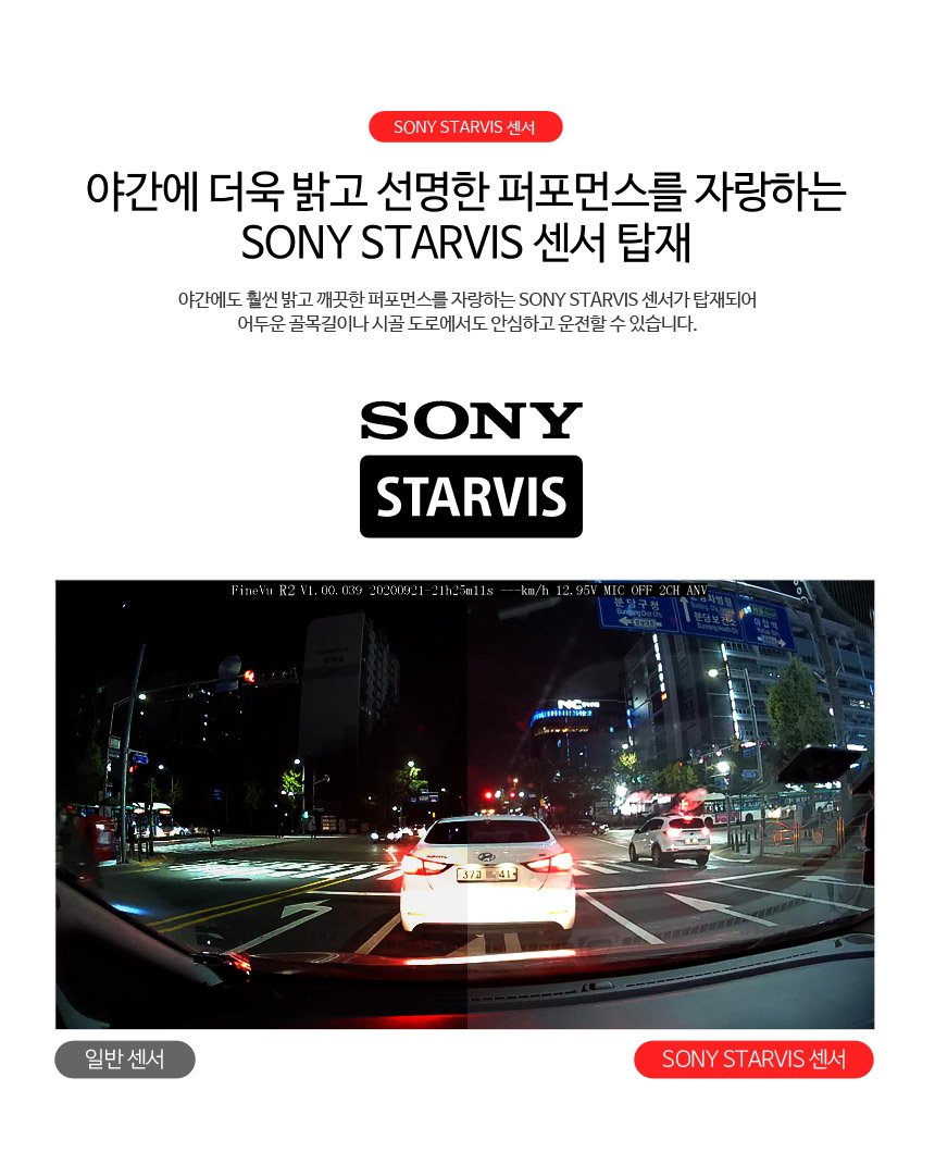 또한, 조도 환경 변화에 따라 최적의 화질로 녹화하는 오토 나이트 비전을 적용해 시간대에 구애받지 않는 선명함을 자랑한다네요. 야간에 더욱 밝고 선명한 퍼포먼스를 자랑하는 소니 스타비스(SONY STARVIS) 센서를 장착했으며, 후방 HDR 적용으로 어느 상황에서든 후방 차량의 번호판을 뚜렷하게 담아낸다합니다.