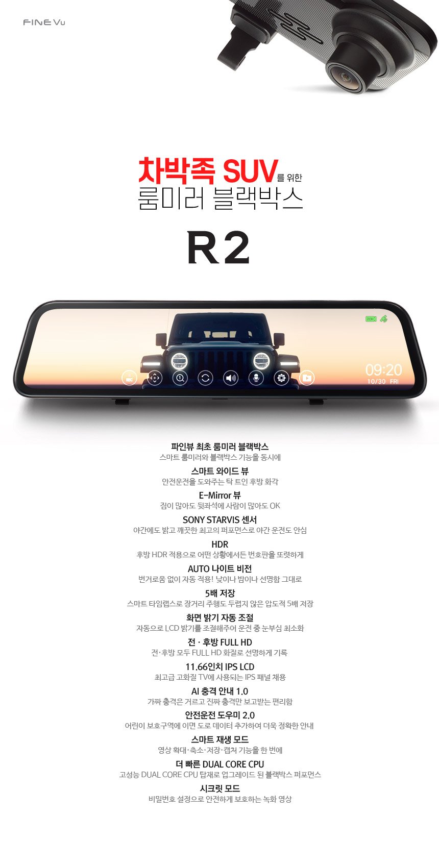 파인디지털이 블랙박스와 룸미러 기능을 결합한 SUV를 위한 국내 최초 5배 저장 룸미러 블랙박스 ‘파인뷰 R2’를 정식 출시한다고 2일 밝혔습니다.‘파인뷰 R2’는 차량의 순정 룸미러를 대체하는 전후방 풀HD 화질의 룸미러 블랙박스입니다. 주행영상 기록 및 저장이라는 블랙박스 본연의 기능은 물론, 안전한 후방 시야 확보에 주력해 안전 운전을 돕는 것이 특징이라 합니다.