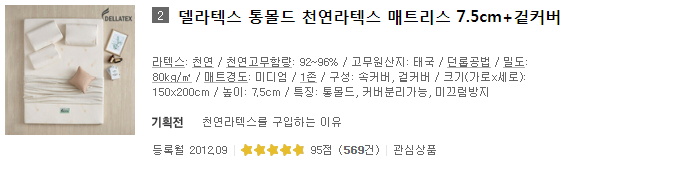 천연라텍스 : 위생이 뛰어나고 밀도별로 다양하게 경도를 선택할 수 있습니다. 단, 몸에서 발생하는 열로 인해 더위를 느낄 수 있고, 열과 빛등에 약해 부스럼이 발생할 수 있습니다.