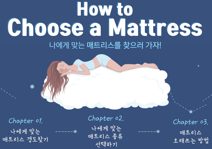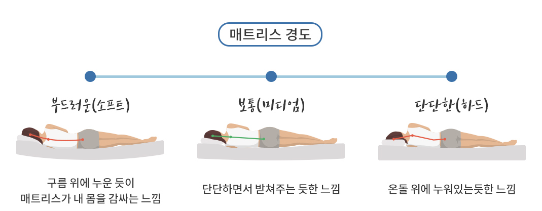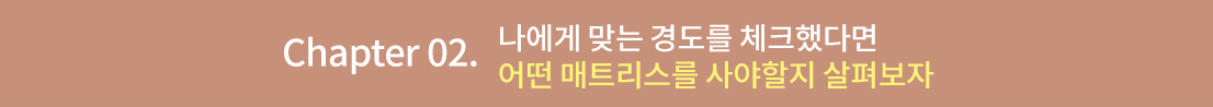 먼저 매트리스 경도를 선택하셔야 하는데요, 이때 체형과 수면자세로 나에게 맞는 경도를 찾을 수 있습니다.