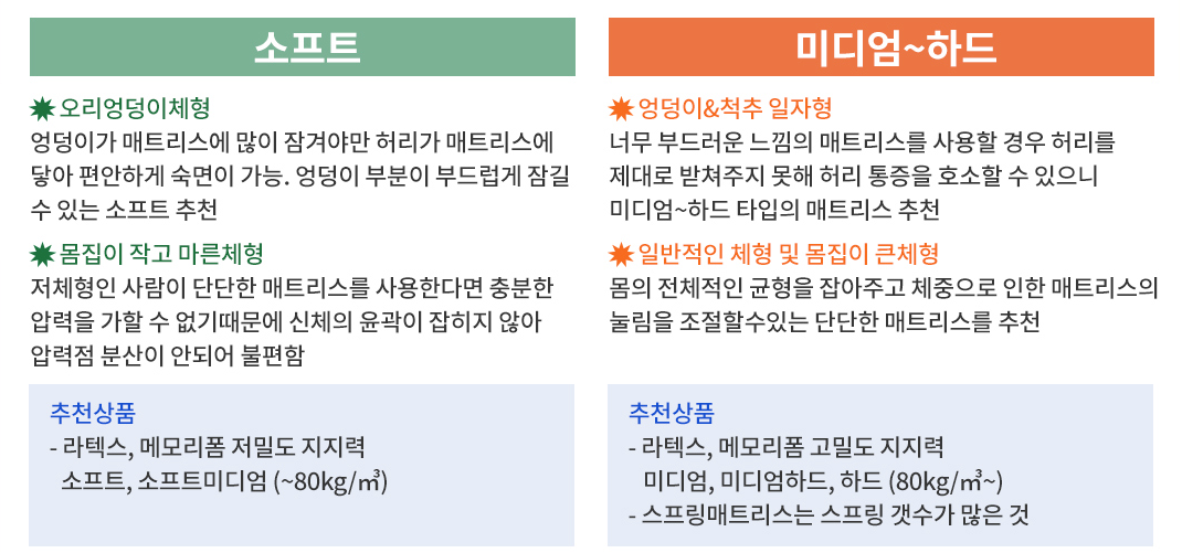 엉덩이가 많이 나온 체형이나 작고 마른체형이면 소프트한 매트리스가 좋은데요, 추천 종류로는 라텍스와 메모리폼 저밀도 지지력 소프트, 소프트미디엄(80kg/m3 이하) 입니다.