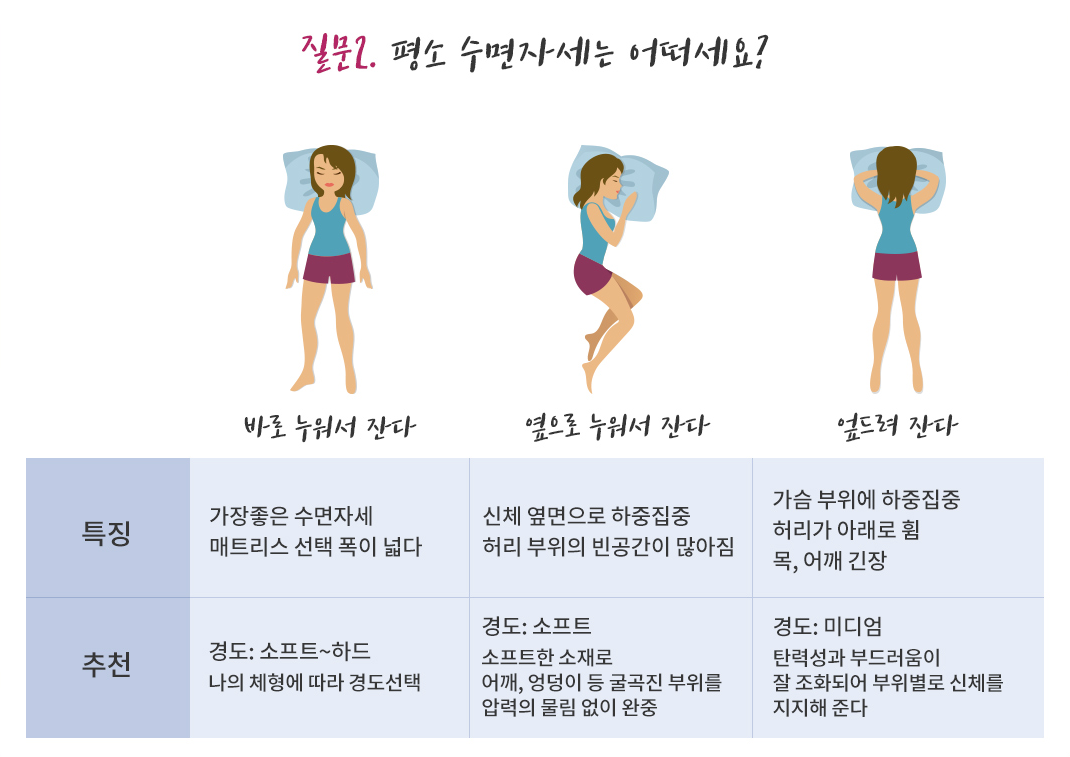 매트리스를 선택함에 있어 수면자세에 따라서도 다른데요, 바로 누워서 자는 경우에는 선택 폭이 넓어 체형이나 본인이 원하는 경도를 선택하시면 됩니다. 옆으로 누워서 자는 경우에는 면적이 작아지기 때문에 하중이 집중되게 되어 소프트한 매트리스를 선택하는게 좋고, 엎드려 자는 경우에는 중간 정도의 경도를 가진 매트리스를 선택하시는 것이 좋습니다.