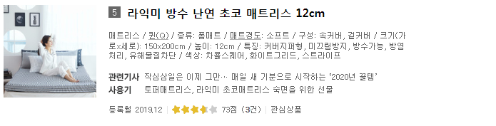 먼저 매트리스 추천 TOP5를 말씀드리자면 1위는 라쏨 프로젝트 슬립 메모리폼 매트리스, 2위는 델라텍스 통몰드 천연라텍스 매트리스, 3위는 센스맘 9존 에어 매트리스, 4위는 퀵슬립 퀵5 롤팩 유로탑 매트리스, 5위는 라익미 방수 난연 초코 매트리스 순 입니다.(특정 사이트에서 참고한 것이라 다른 곳에서는 조금 다를 수 있는 점 참고해주세요