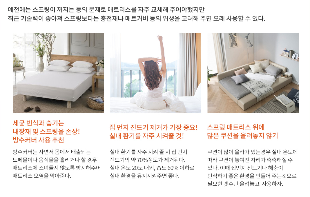 몸에서 배출되는 노폐물이나 음식물을 흘릴 수 있기 때문에 매트리스에 스며들지 않도록 방수커버를 씌워 매트리스 오염을 막아주는 것이 좋고, 실내환기와 적절한 온도, 습도를 맞춰주는 것이 좋습니다. 또, 매트리스 위에 베게나 쿠션같은 것을 많이 올리지 않도록 하는 것이 좋습니다.