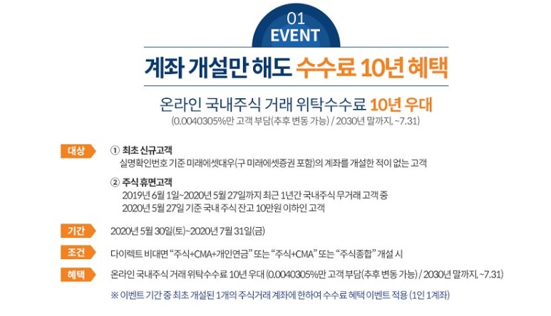 그런데 이번 후기에서는 지금까지 소개해 드린 것이 메인이 아닌 미래에셋대우에서 진행중인 수수료 혜택 이벤트를 소개해 드리기 위함입니다. 한번 함께 살펴보시죠.