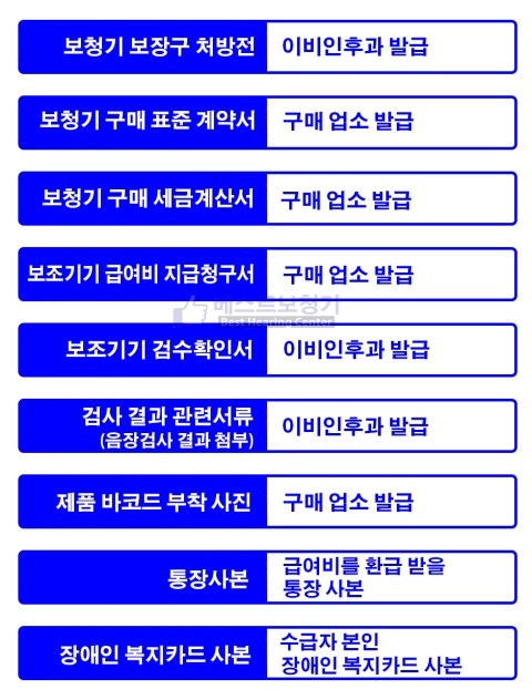 음장검사 결과 관련 서류, 보조 기기 검수확인서, 장애인 복지카드 사본, 통장 사본, 보청기 구매 표준 계약서