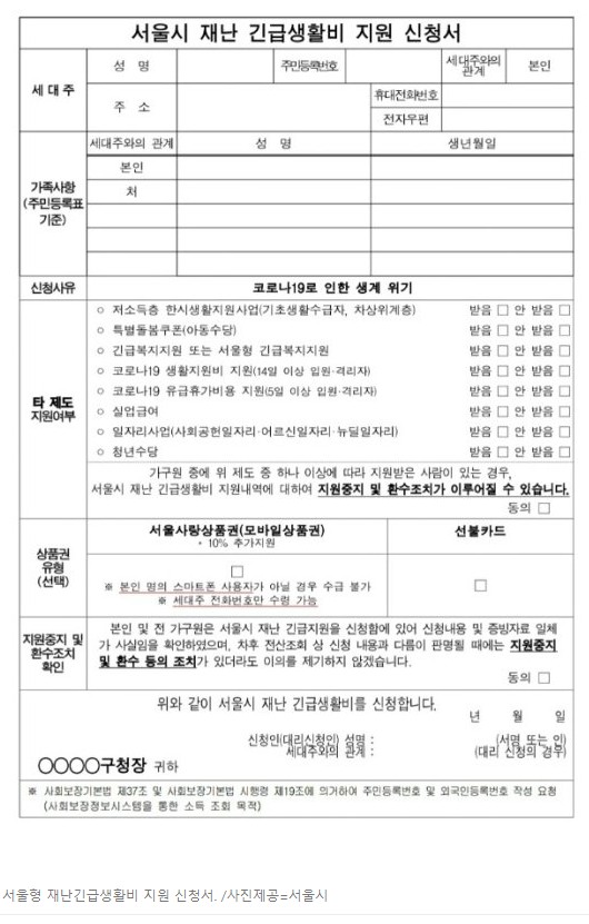 서울형 재난 긴급생활비 지원 신청서를 작성하여 주민센터에 제출하면 1차적으로 행복e음시스템을 통해 신청자 소득 조회가 이루어지고, 완료되면 3~4일 내로 모바일 지역 사랑상품권이나 선불카드로 선택 지급할 계획이라고 합니다.