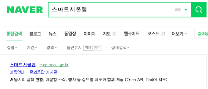 1. 검색창에 '스마트 서울맵'을 검색합니다. 2. '스마트 서울맵' 홈페이지에 접속합니다. |