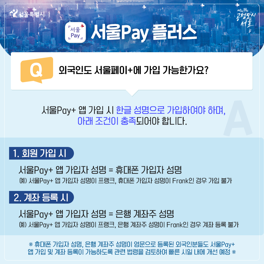 서울Pay+ 앱 가입 시 한글 성명으로 가입하여야 하며,