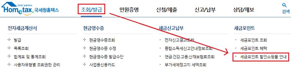 ② 홈택스 메뉴에서 조회/발급> 세금포인트 할인쇼핑몰 안내 화면으로 이동하기