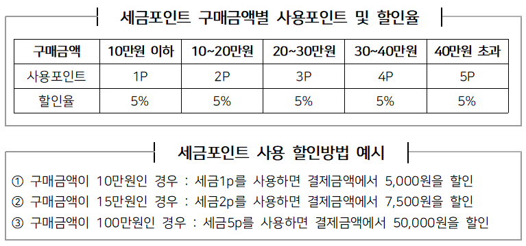 세금포인트를 보유한 개인납세자와 법인납세자(9월 중 개통)는 중소기업제품을 구매할 때 세금포인트를 이용해 1p당 총 구매금액의 5% 할인혜택을 적용받을 수 있습니다.