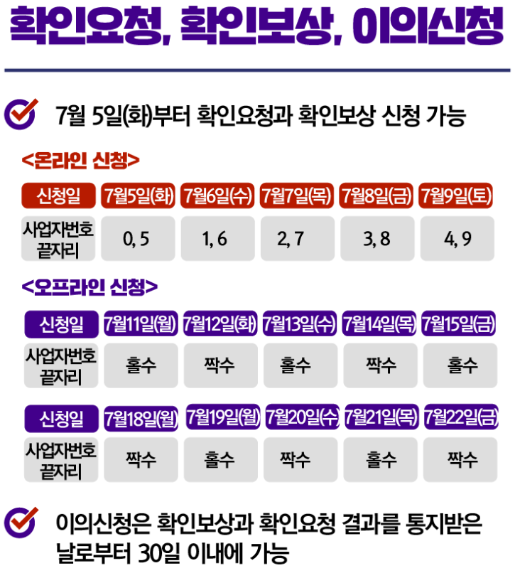 온라인 신청과 현장접수로 나뉘어 신청을 받으며, 신속보상 대상과 확인요청 및 확인보상 대상과는 신청일이 서로 상이 하기때문에 잘 확인하시고 신청하시길 바랍니다. 각 해당 신청 일자는 아래와 같습니다.