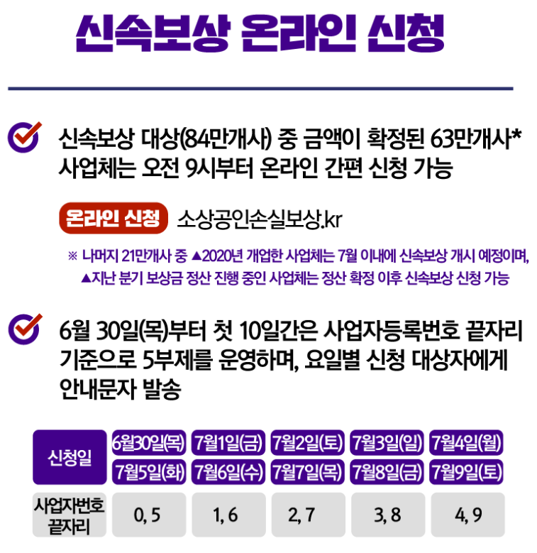 올해 1분기 코로나19 소상공인 손실보상액으로 사업체 94만곳에 3조 5000억원이 지급됩니다. 신속보상 대상자(84만곳) 중 금액이 확정된 63만곳은 30일부터 온라인 신청이 가능하고 30일부터 10일간 사업자등록번호 끝자리를 기준으로 5부제가 시행되며, 오후 4시까지 신청하면 당일 보상금을 받을 수 있습니다.