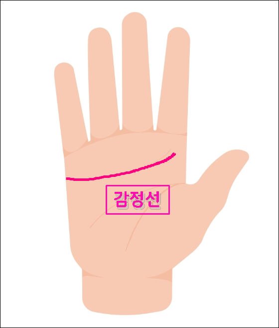 감정선은 본인의 감정, 성격을 나타내는 선으로 위로 올라면 밝은 성격, 아래로 내려가면 걱정이 많은 성격입니다.